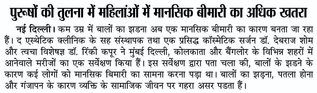 Ignoring Early Hair Fall In Young Age, a Leading Cause Of Mental Illness – Dainik Jagran, Delhi